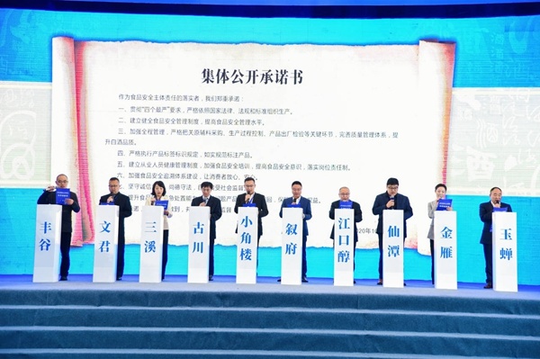 筑质量根基,酿品质川酒。10月29日,由省食安办、省市场监管局主办的“四川白酒品质提升工程”启动仪式暨“提升白酒质量 企业公开承诺”活动在泸州举行。副省长李云泽出席,国家市场监管总局食品生产司司长马纯良,省食安办主任、省市场监管局局长万鹏龙就四川白酒品质提升工程实施提出明确要求,泸州市委书记刘强发表致辞,省直相关部门、白酒主产区政府及川酒企业代表参会,以川酒 “六朵金花”、 “十朵小金花”等为代表的全省100户重点白酒生产企业负责人,就不断提升川酒品质,通过宣誓、签名等方式作出公开承诺。