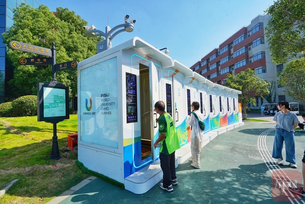 大运村内东侧设置了一处特别的大运村应急如厕保障空间,这里布局了多个“成都智造”智慧厕所。