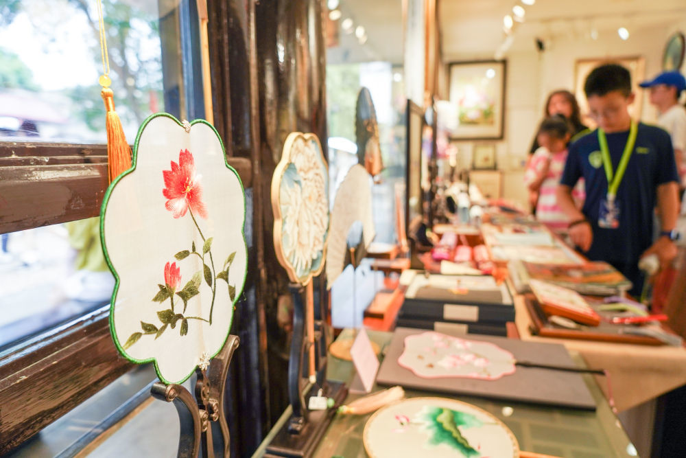 7月6日,游客在平江路一家苏绣店内选购纪念品。