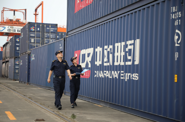 成都海关关员对中欧班列集装箱货物堆场进行巡查。成都海关供图
