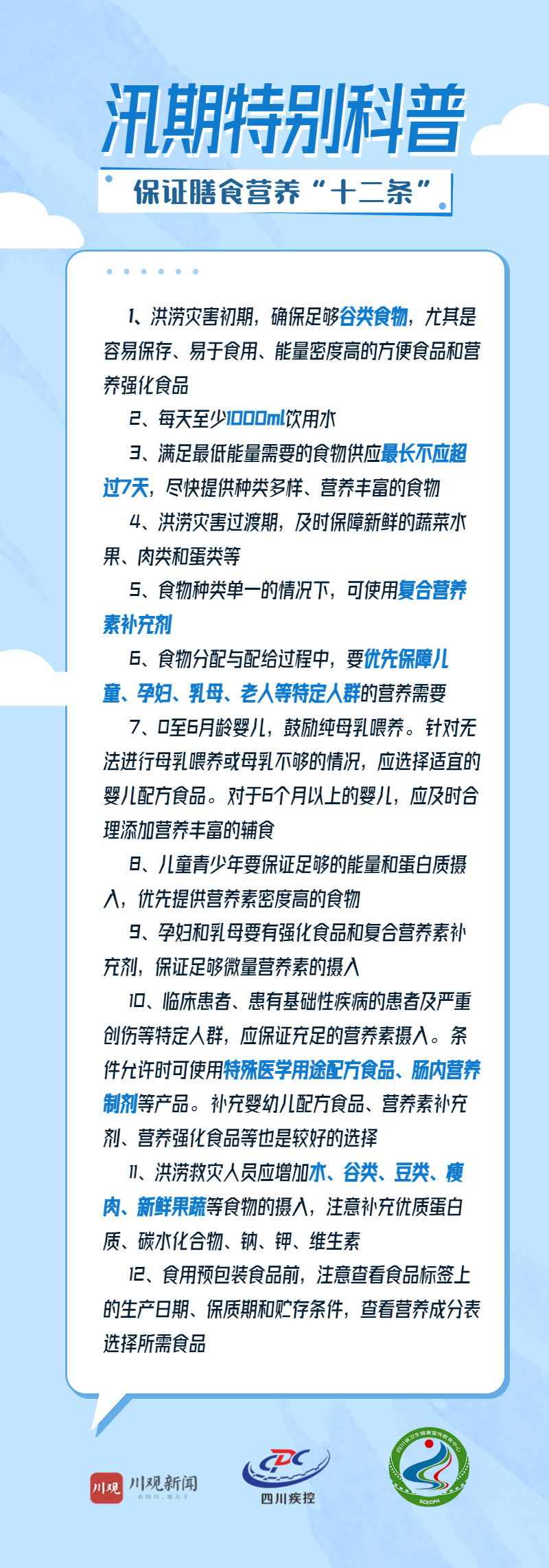 最后,为让网民们在汛期的膳食营养得到保障,川观新闻联动四川疾控、四川省卫生健康宣教中心梳理了一份膳食营养要点,快来看看吧。
