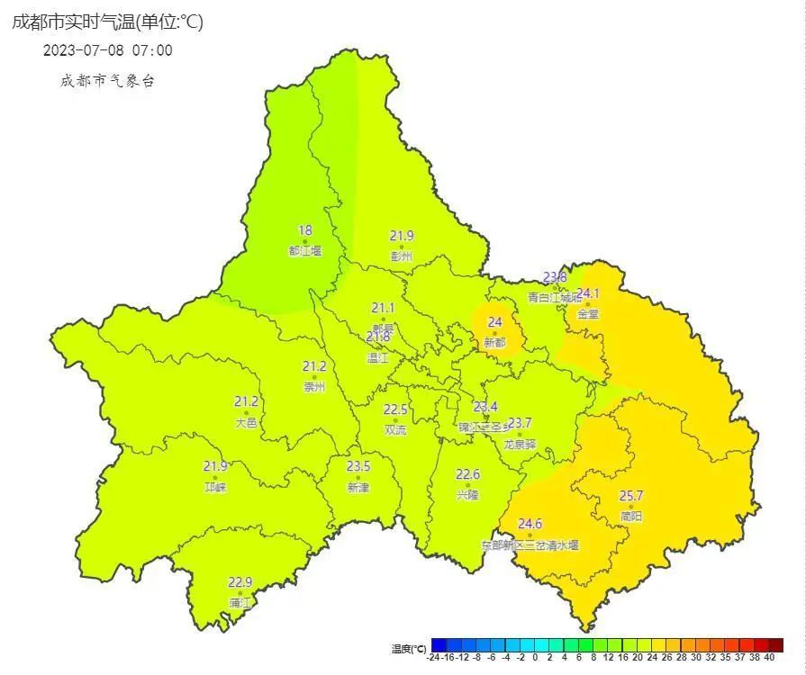 成都市气象台2023年07月08日09时30分发布高温橙色预警信号:预计我市武侯区、锦江区、青羊区、成华区、金牛区、青白江区、高新南区、高新西区和成都东部新区的所有乡镇(街道)未来24小时内最高气温将升至35℃以上。高温时段主要出现在今日13时至18时。请注意防范高温带来的不利影响。