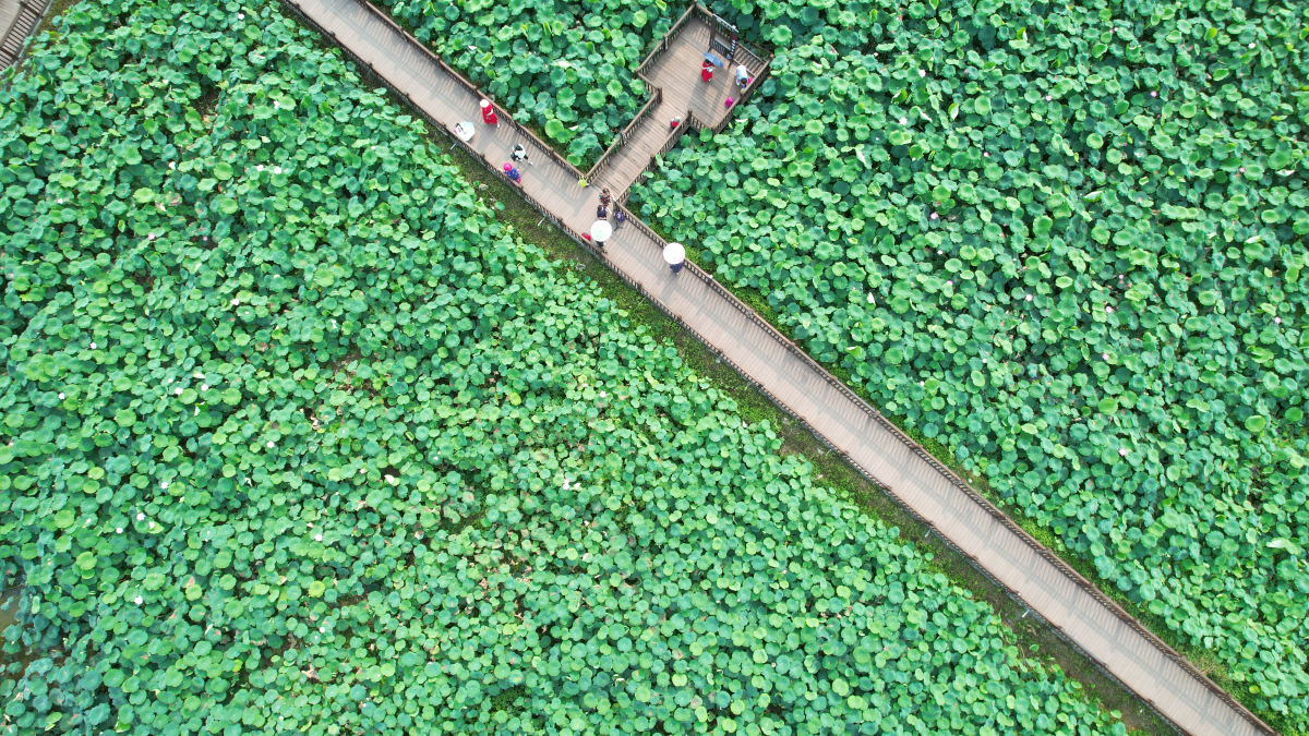 涪城区“湖光山色”稻渔亲水湿地农业主题公园荷叶碧绿接连成片。