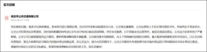 保定市公共交通有限公司之后回复称,自2020年初新冠疫情发生以来,公交客运量骤降,公交运营收入不足正常经营的30%,并始终处于低迷状态,公交公司经营资金异常紧张,同时首批购置的纯电动公交车动力电池已超出质保期限,存在安全隐患,已不具备安全运营条件,被迫全部退出营运,公交运力安排受到了严重影响。