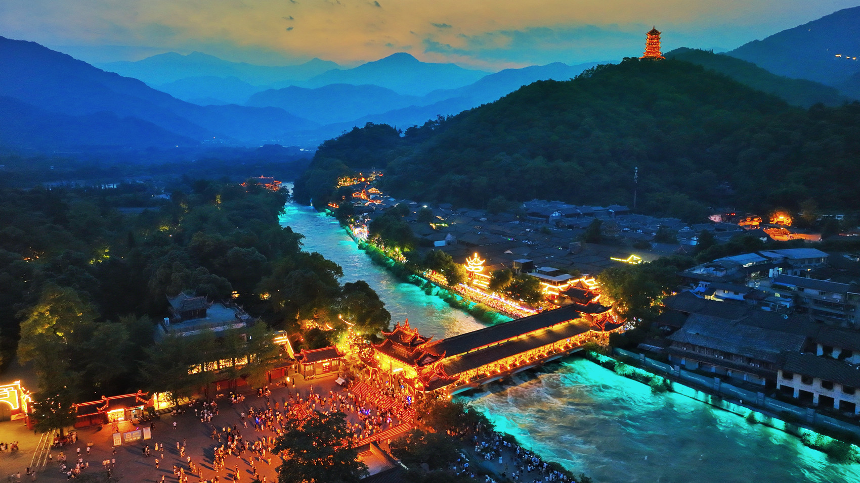 夜幕降临,都江堰的桥梁被霓虹灯绚烂装点,岷江水从桥底流过,仿佛盖上了一层蓝色轻纱,流动的河水恰似倾泻的蓝色眼泪,“蓝眼泪”因此得名。“站在桥上如同置身于蓝绿色海洋之中,看着滚滚岷江从脚下奔腾而过,水雾迎面而来,绝美的风景让人难以忘怀。”成都游客周明芳说。