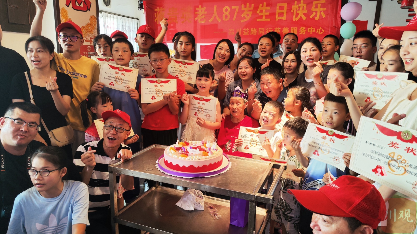 7月9日下午,四川益路同行慈善服务中心组织60多位志愿者,为关注多年的“口袋婆婆”蒋贵英老人,热热闹闹地举办了87岁生日宴。
