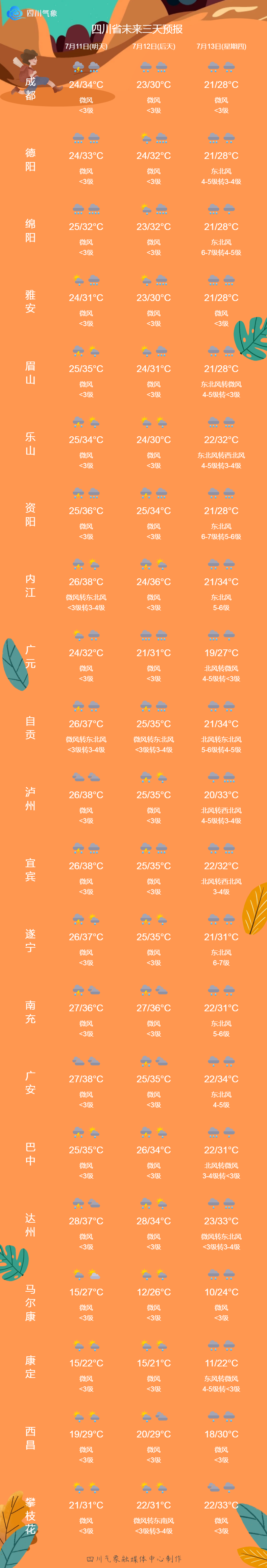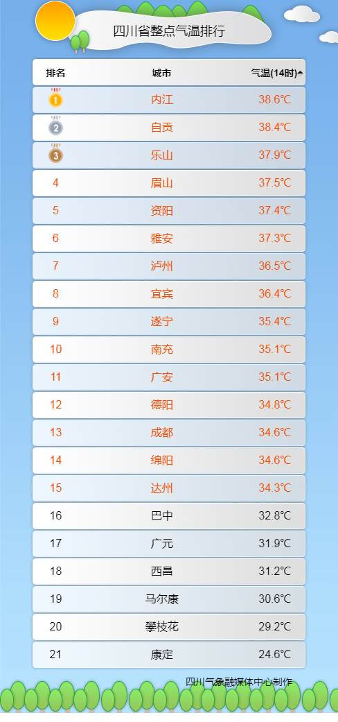 24小时内,盆地最低气温:25~28℃;最高气温:西部32~34℃,东部35~38℃。