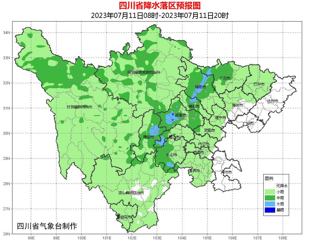 今天晚上:广元、绵阳、德阳、成都、雅安、眉山、乐山、巴中8市阴天间多云,部分地方有阵雨或雷雨,局部中雨,盆地其余地方多云;川西高原多云间阴,部分地方有阵雨或雷雨;攀西地区阴天间多云有分散阵雨或雷雨。