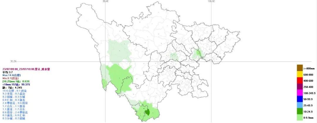 昨天08时到今天08时,盆地大部晴,个别地方阵雨,高原大部晴,甘孜州局部阵雨,攀西北部晴,南部阵雨。盆地最低气温23到26度,最高气温34到37度。