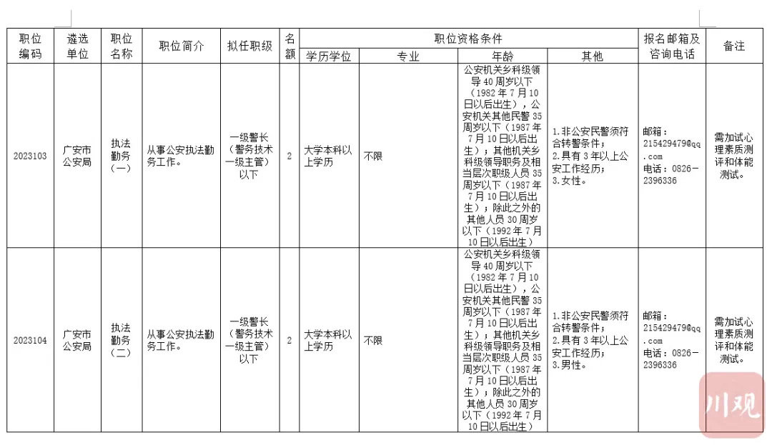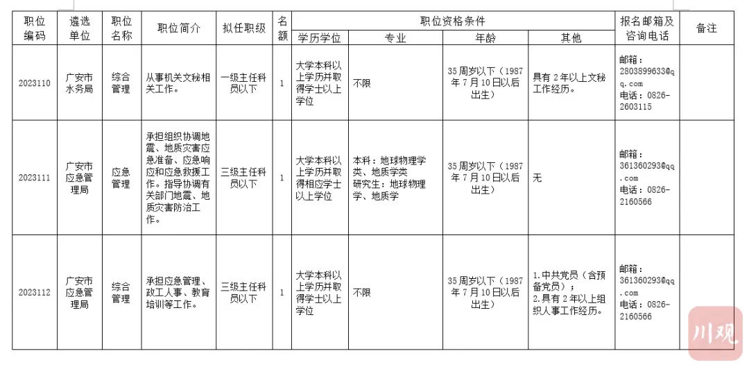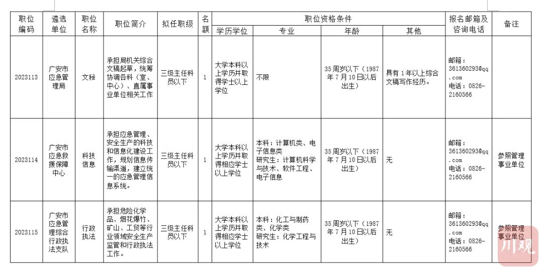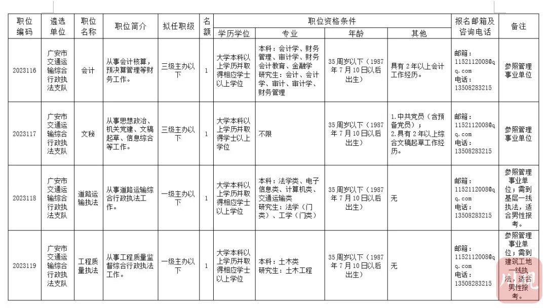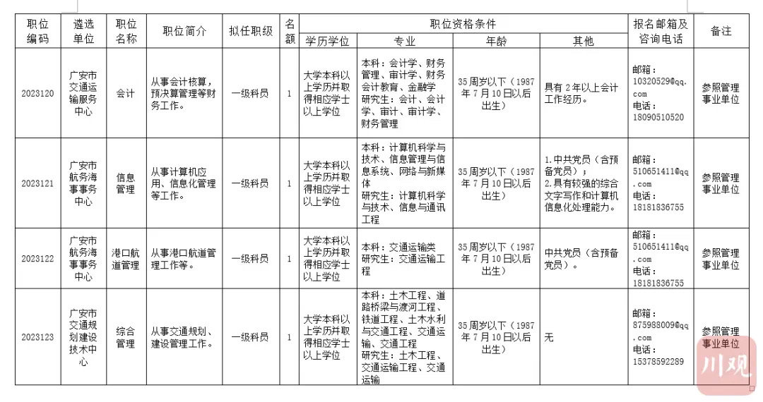 报考人员可登录“智慧党建·小平故里先锋”官网(网址:http://www.gadj.gov.cn/index.html),查询简章、职位以及咨询电话等信息。报名时间为2023年7月10日至7月15日,笔试时间为2023年7月29日。