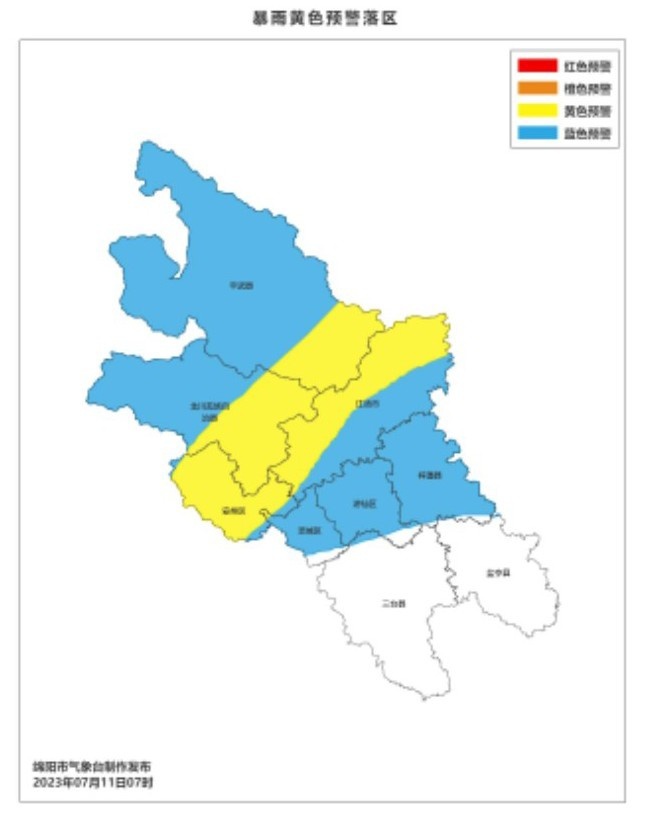★绵阳市发布暴雨黄色预警:7月10日夜间平武南部、北川东部、安州西部、江油西部出现了大雨到暴雨,局部大暴雨。预计7月11日白天到晚上,平武、北川、安州、江油、梓潼、涪城、游仙有大雨到暴雨(40—80毫米),其中平武、北川、安州、江油的局部地方大暴雨(100—150毫米),雷雨时伴有短时阵性大风。