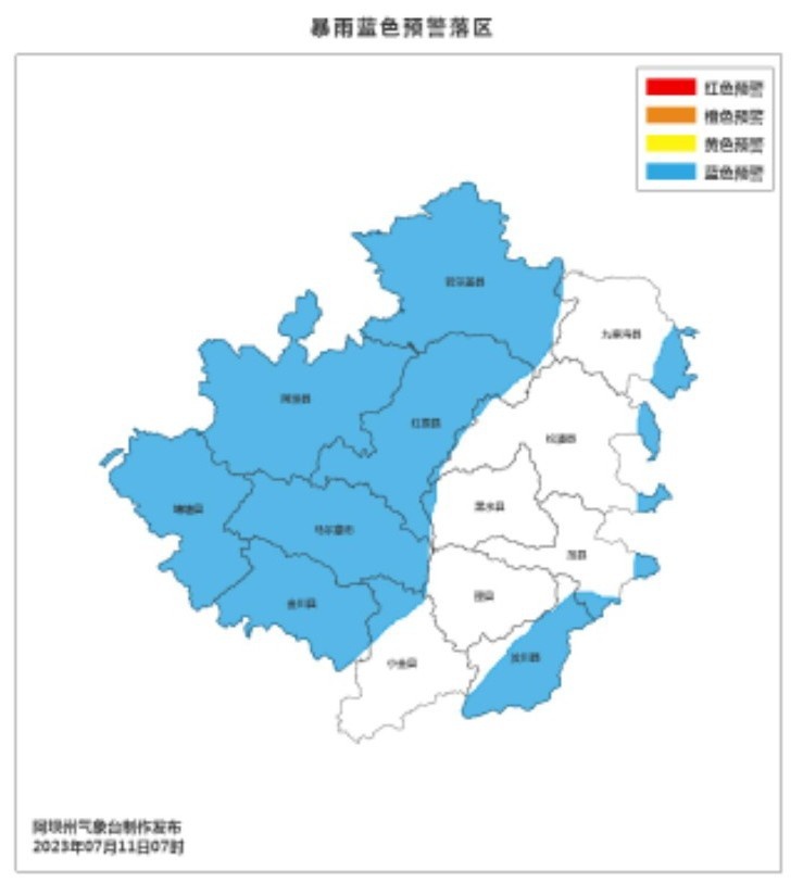 7月11日上午,截至记者发稿,四川省有5个市级气象台发布了暴雨预警,请相关地区注意预防强降水可能引发的山洪、中小河流洪水、地质灾害、城市内涝等次生气象灾害的发生,并做好雷电、大风、冰雹等强对流天气防御工作: