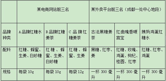 另一个疑惑来自于配料。记者整理淘宝电商网站和美团外卖平台销量前三名的“姨妈热饮”,分析其配料发现,纯红糖制作的较少,搭配含有蜂蜜、白砂糖、生姜、玫瑰、鸡蛋、枸杞、桂圆等配料。
