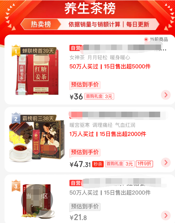 在京东,销量最高的“姨妈热饮”单品,标签自带“大姨妈”“送女友”“生理期驱寒暖宫”等标签,该单品15天售出超5000件,已有50万人买过。