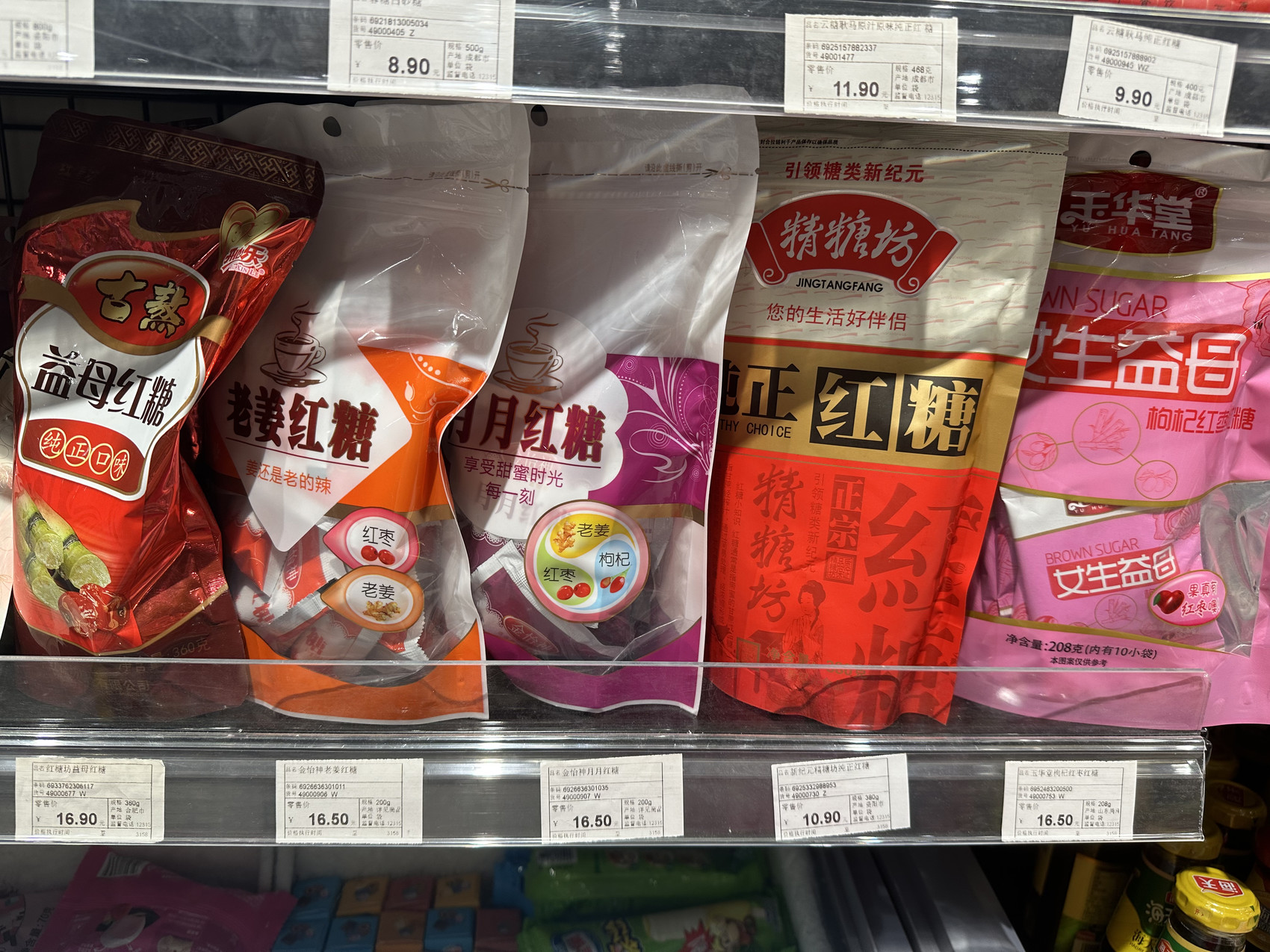 记者还实地走访线下商超,货架上售卖的含有红糖的产品,种类主要有阿胶红糖、古方红糖和益母红糖,价格普遍在10元到20多元之间浮动,但在对外销售时并没有明确将”姨妈热饮“的标签放置在售货架上。