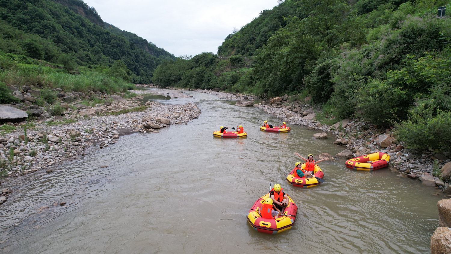 蜿蜒清澈的渔洞河串起一个个村庄,游客乘橡皮艇顺流而下,既能感受陡坡弯处水花四溅的刺激,又能在平缓地带尽享夏日凉爽。