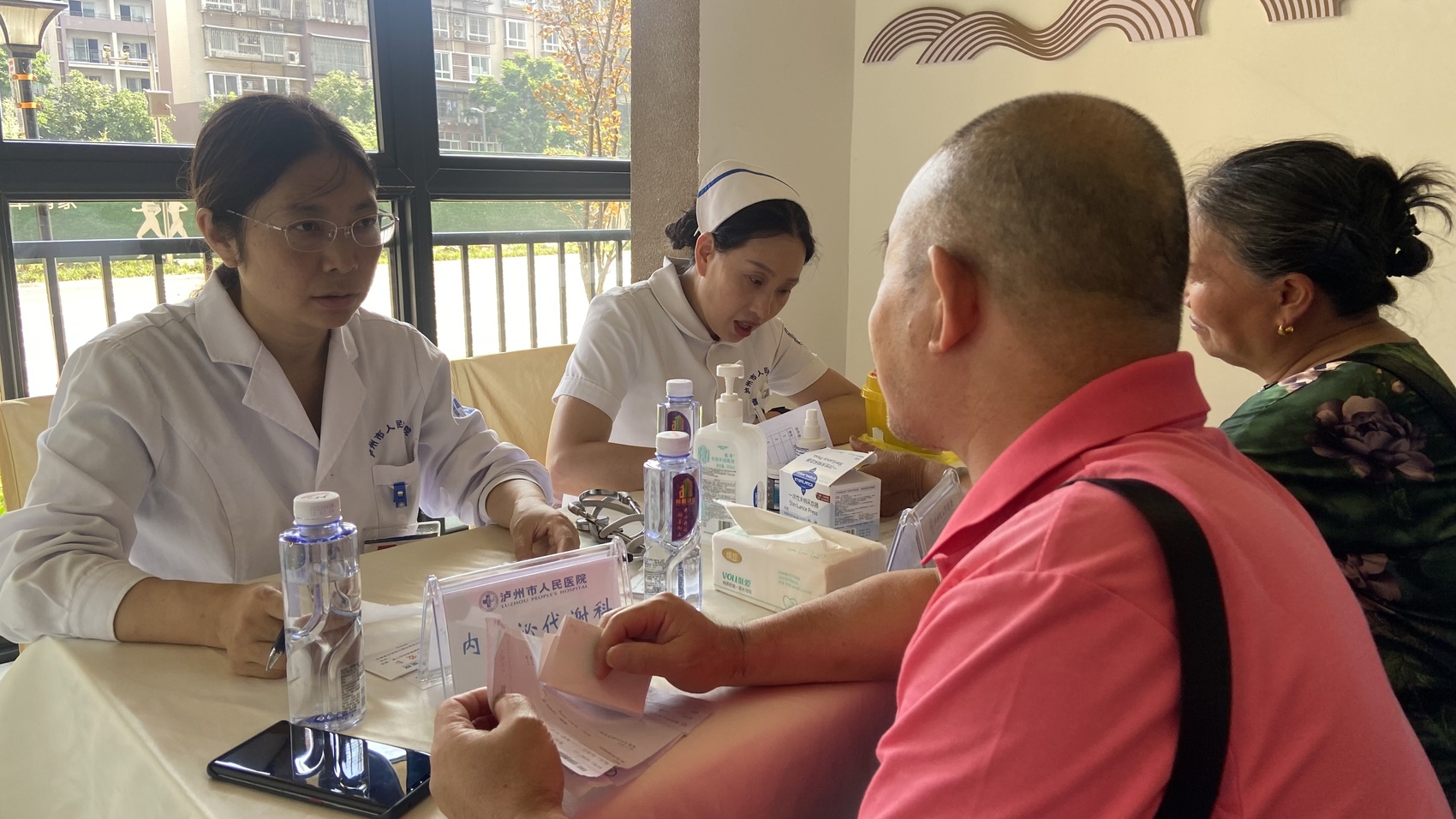 “手脚麻不麻?”“今天这种情况出现过2次。”“您今年多大岁数了?”“多久查出糖尿病的?”7月10日上午9时40分许,泸州市江阳区泰安街道高新·悦城小区“共享空间”的医养中心内,泸州市人民医院正在“摆摊设点”,开展“健康社区共建共享”义诊活动。