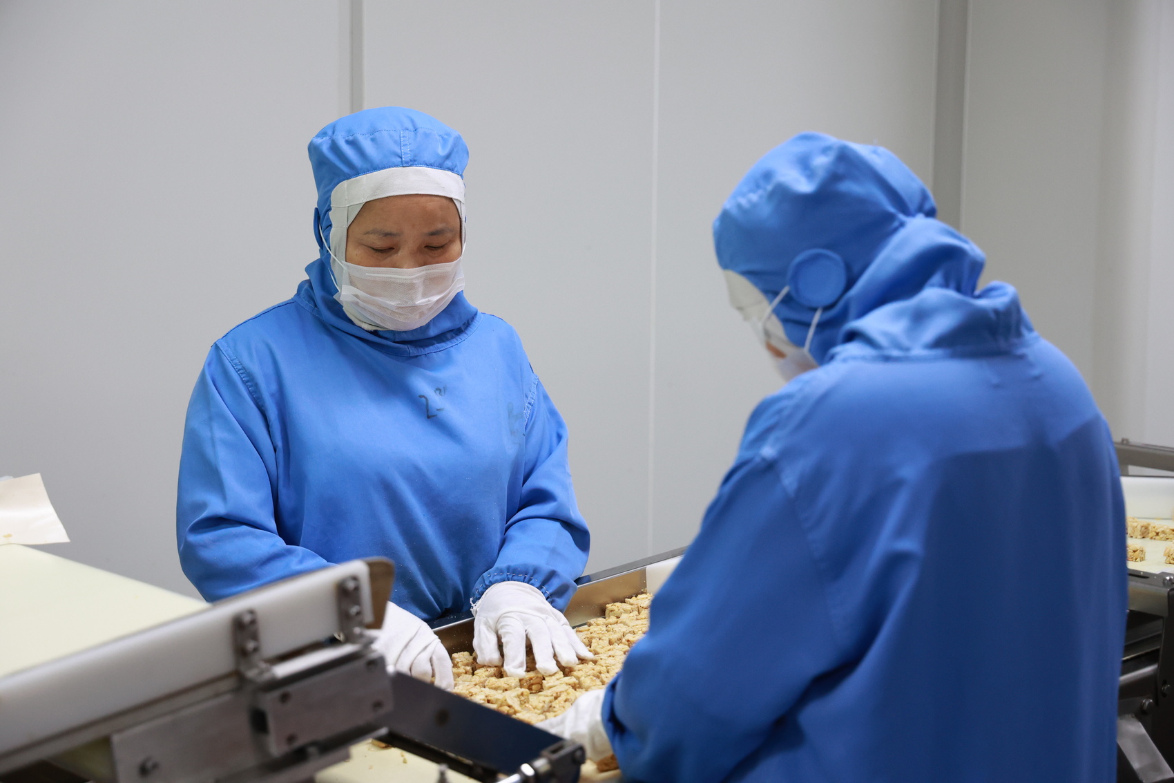 经过一道道生产工序后,花生米变成了花生酥,各种口味的花生酥随着流水线进入外包车间,工人们忙着将花生酥装袋装箱,准备发货。