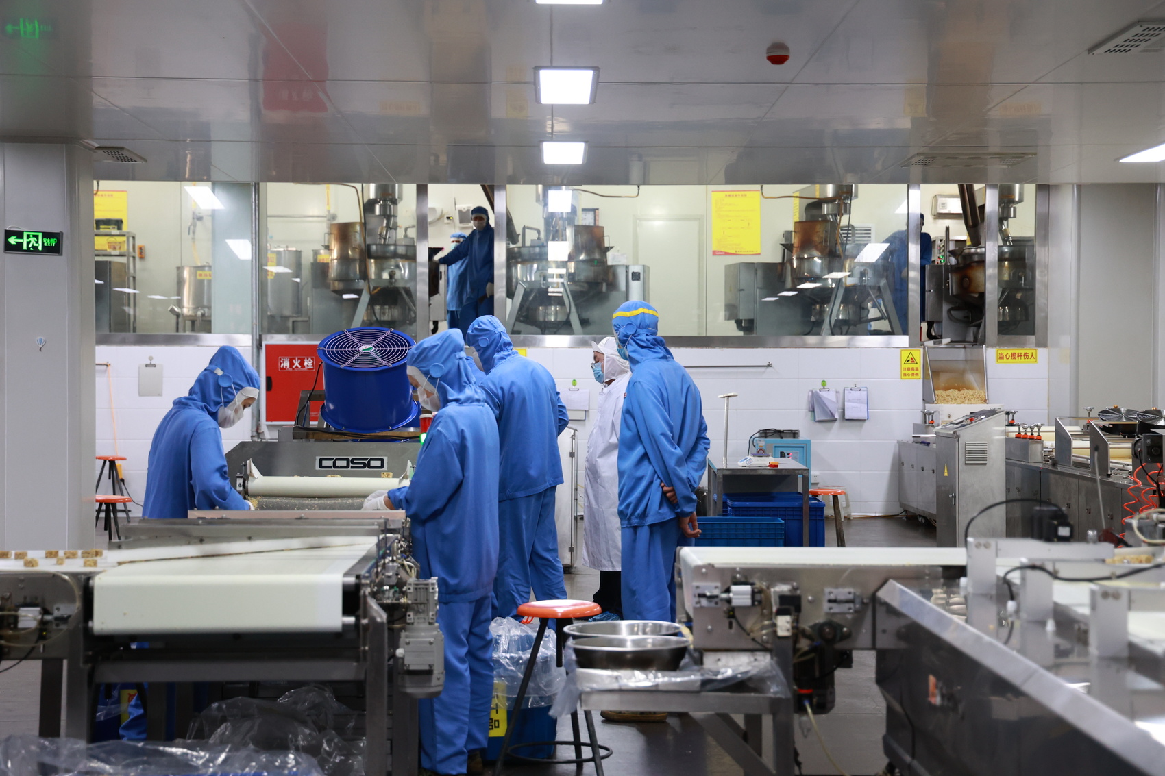 “这两条生产线的花生酥专供出口。”黄老五食品股份有限公司负责人黄老五介绍道,花生酥的制作要经历熬糖、炒制、加料、切分等多道工序才能制成。如今的花生酥在传承祖传古法技艺的基础上,将糖与花生比例进行重新调配,糖只作为黏合花生的辅料,以花生和坚果为主料,让花生酥清甜不腻、酥脆不粘牙。