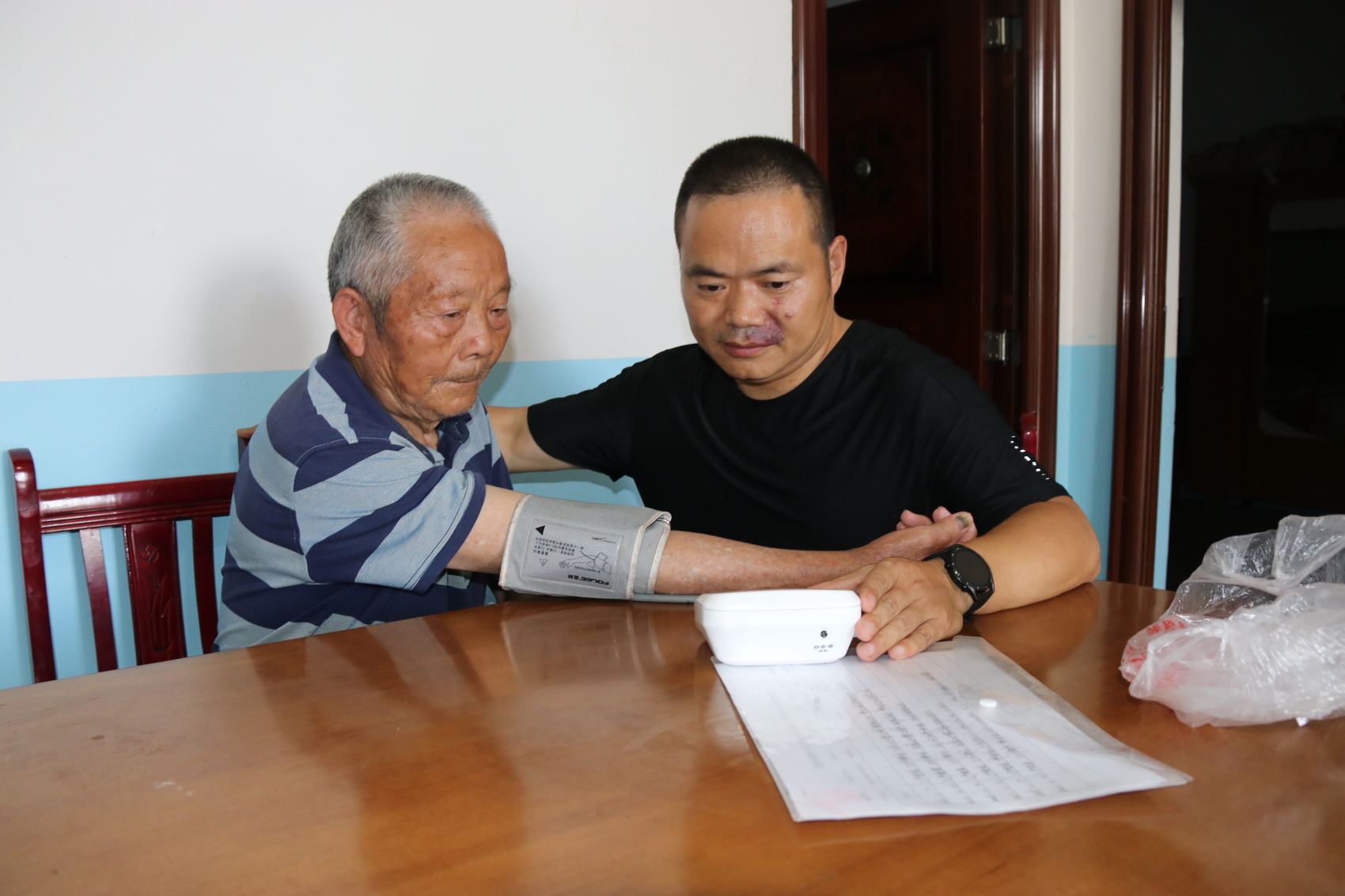 周海为芝兰坝村留守老人量血压。 张斌 摄