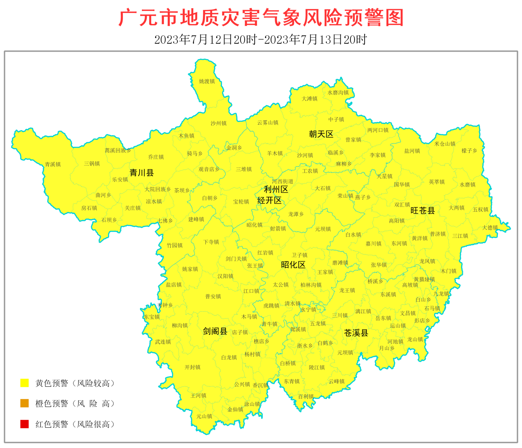 广元市地质灾害指挥部同步发布地质灾害气象风险预警:7月12日20时-7月13日20时,广元市全境发生地质灾害的风险较高(黄色预警)。
