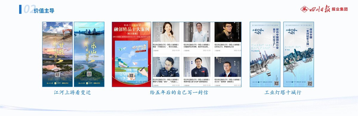 二是价值主导。在服务中心大局中彰显价值,“江河上游看变迁”等特色专题获中宣部新闻阅评肯定,“给五年后的自己写封信”入选中国记协“党的二十大报道融创精品十大案例”,“工业灯塔十城行”等唱响经济“光明论”,提升全国影响。在文化传承发展中弘扬价值,推出 “考古中国 从蜀地出发”等重点策划,擦亮三星堆、三苏文化等金字招牌,恢复设立四川日报“川观文学奖”,创办“西岭雪”文艺评论频道,切实担负起新的文化使命。在民生民情共振中突出价值,“民情热线”栏目、民情频道每日更新,联合相关部门持续为群众排忧解难,舆论监督报道多次获得中国新闻奖;做强“川观辟谣”等品牌栏目,有效引导社会舆论。