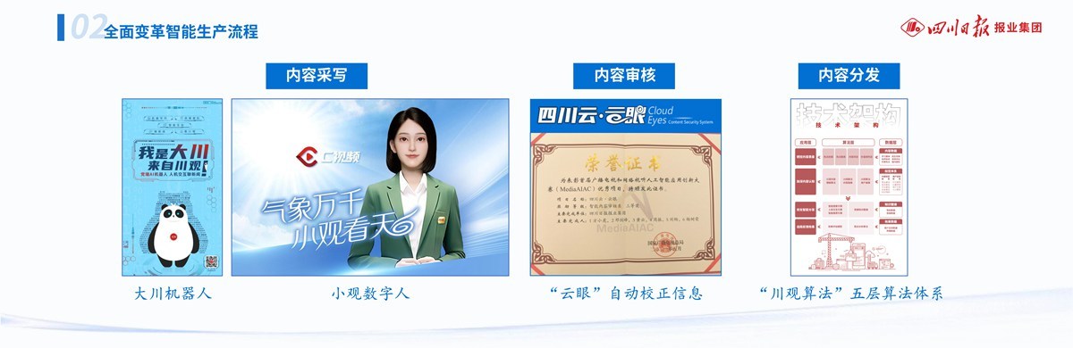 二是全面变革智能生产流程。线索采集上,运用线索监控机器人提高快速反应能力,自主研发的“一种数据智能爬取方法”获得国家专利。内容采写上,研发大川机器人和小观数字人,积极探索AIGC生产。内容审核上,用安全监测系统“云眼”自动高效校正错误信息。内容分发上,“川观算法”首创五层算法体系,让主流价值判断与用户兴趣推荐相结合。流程融合上,打通新媒体采编系统和报纸出版系统,实现智媒采编一体化。
