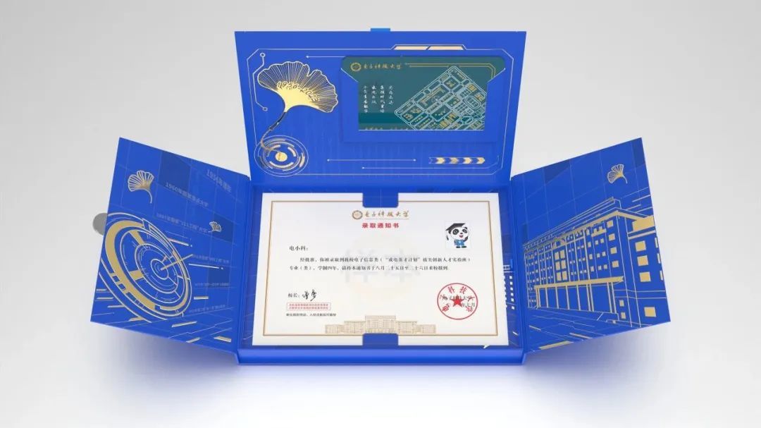 电子科技大学本科录取通知书礼盒中有银杏叶书签、AR电路板等。值得一提的是,扫描电路板,可以生成3D校园图景。