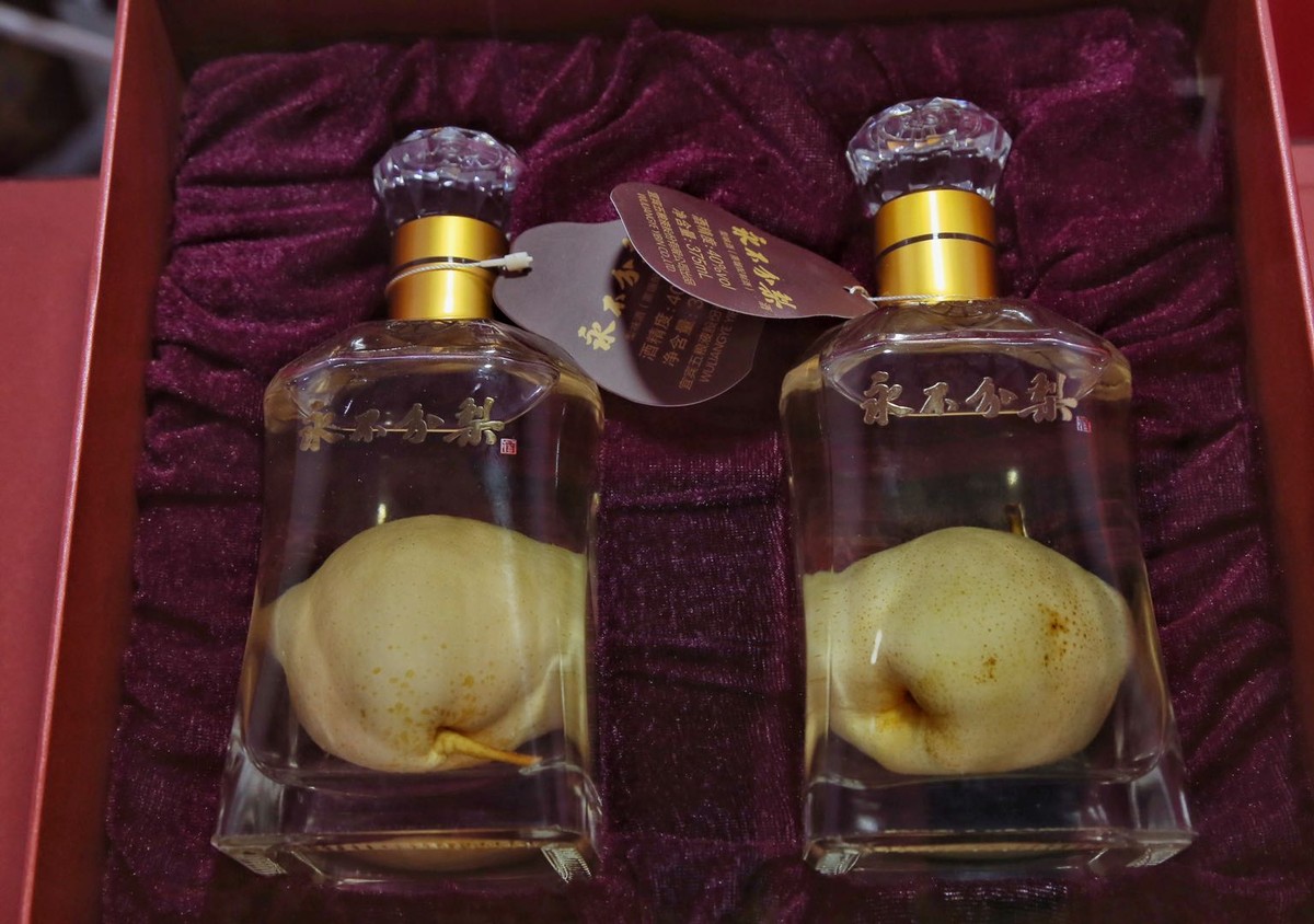 永不分梨酒,采用的邯郸魏县鸭梨,鸭梨从小在酒瓶中长大,再经过27道工序制作而成。周梦颖摄
