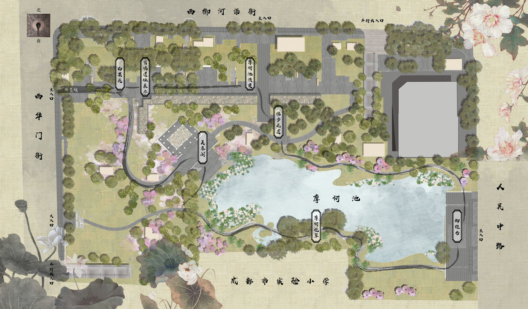 摩诃池一期项目位于天府文化公园核心区人民中路以西,西华门街以东,实验小学以北,西御河沿街以南,项目总占地面积约63亩。其所在区域作为成都的政治、文化和教育中心,更是成都2300年城址未变,城名未替的见证,为了重现历史上的摩诃盛景,园内造景也极为讲究。