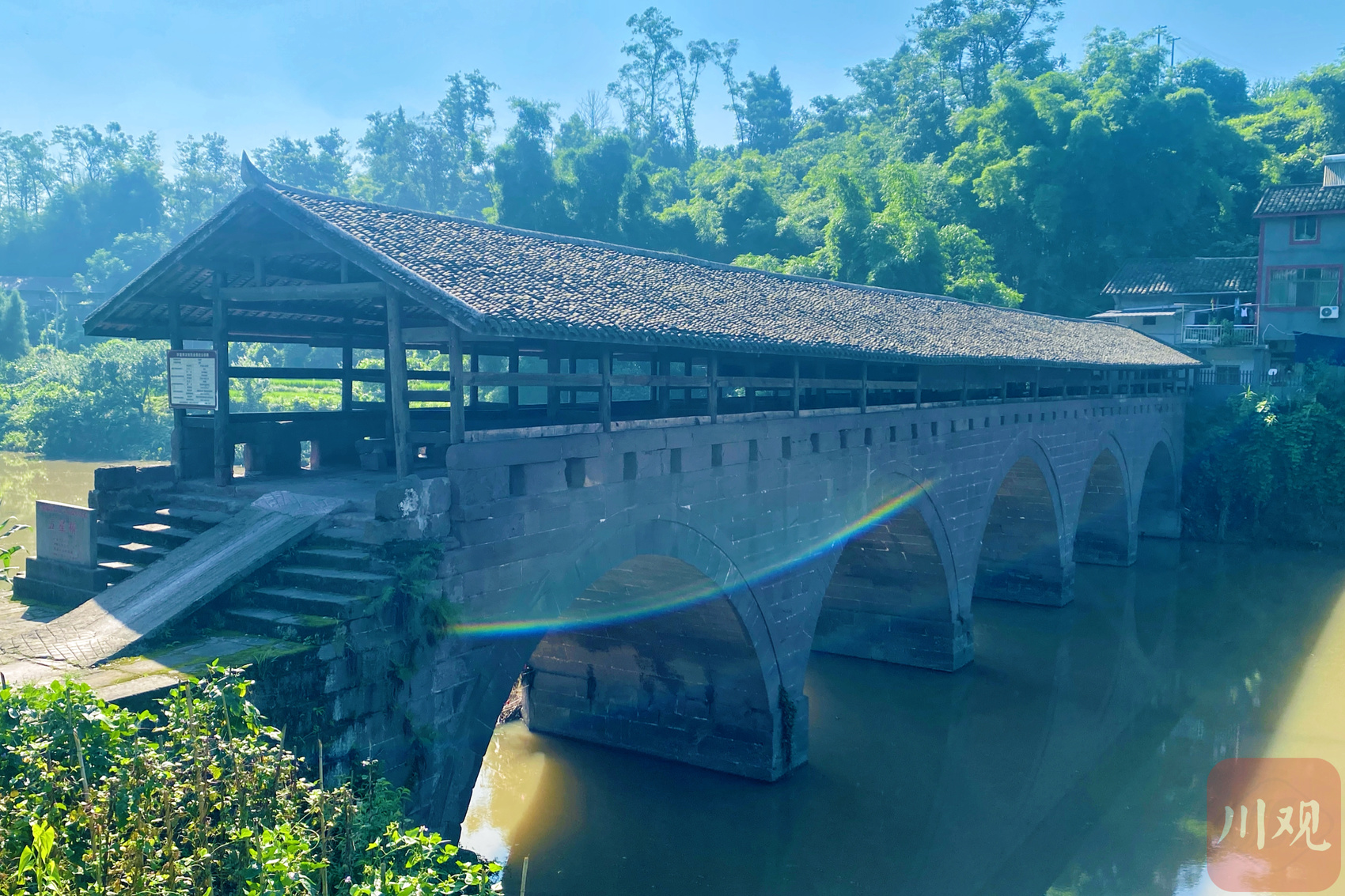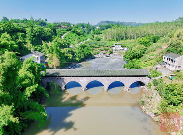据悉,五星桥修建于清道光七年(公元1827年),是一座南北走向的五孔券拱石桥,桥长68米,宽6米。行走在五星桥上,看着硬山式穿斗木结构廊坊建筑、悬山式屋顶,小青瓦屋面,踏着脚下板石铺砌的桥面,仿佛穿行在历史的长廊。数百年的岁月流转中,这座桥承载的不仅是往来通行贸易、历史变迁,还有川渝两地的深厚情谊。