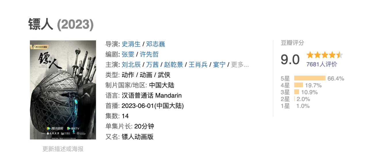 由腾讯视频、新漫画出品,改编自许先哲同名漫画的动画《镖人》目前正在腾讯视频热播。7月14日,记者在豆瓣看到,该剧评分高达9.0,已超过此前热播的动画《中国奇谭》。