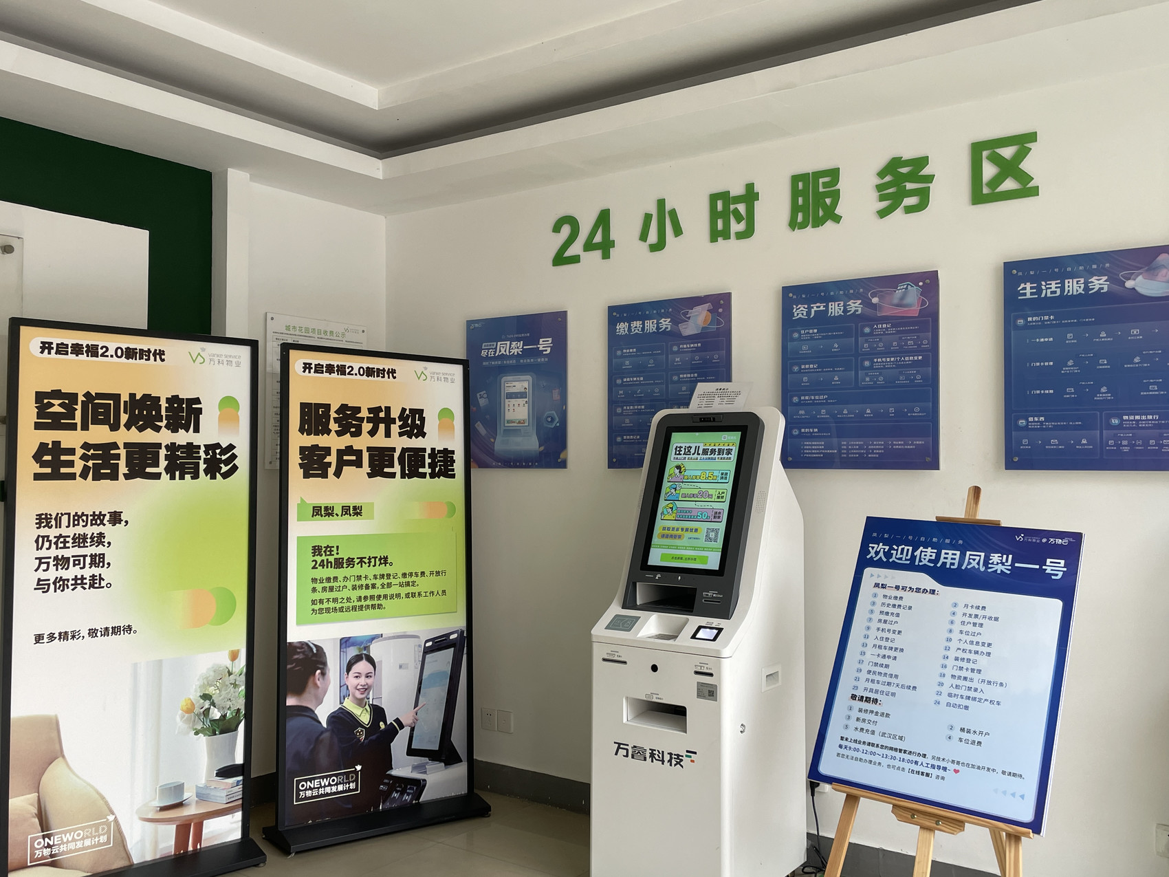在万科城市花园,万物云自主研发的24小时自助式服务智慧设备——“凤梨一号”为业主提供了大大的便利。通过这台自助终端服务机,业主可以办理24项服务,包括物业缴费、月卡续费、查询历史缴费记录、预缴充值、房屋过户、装修备案等事项,涵盖了资产服务、人行服务、车行服务和物业费缴纳等方面。