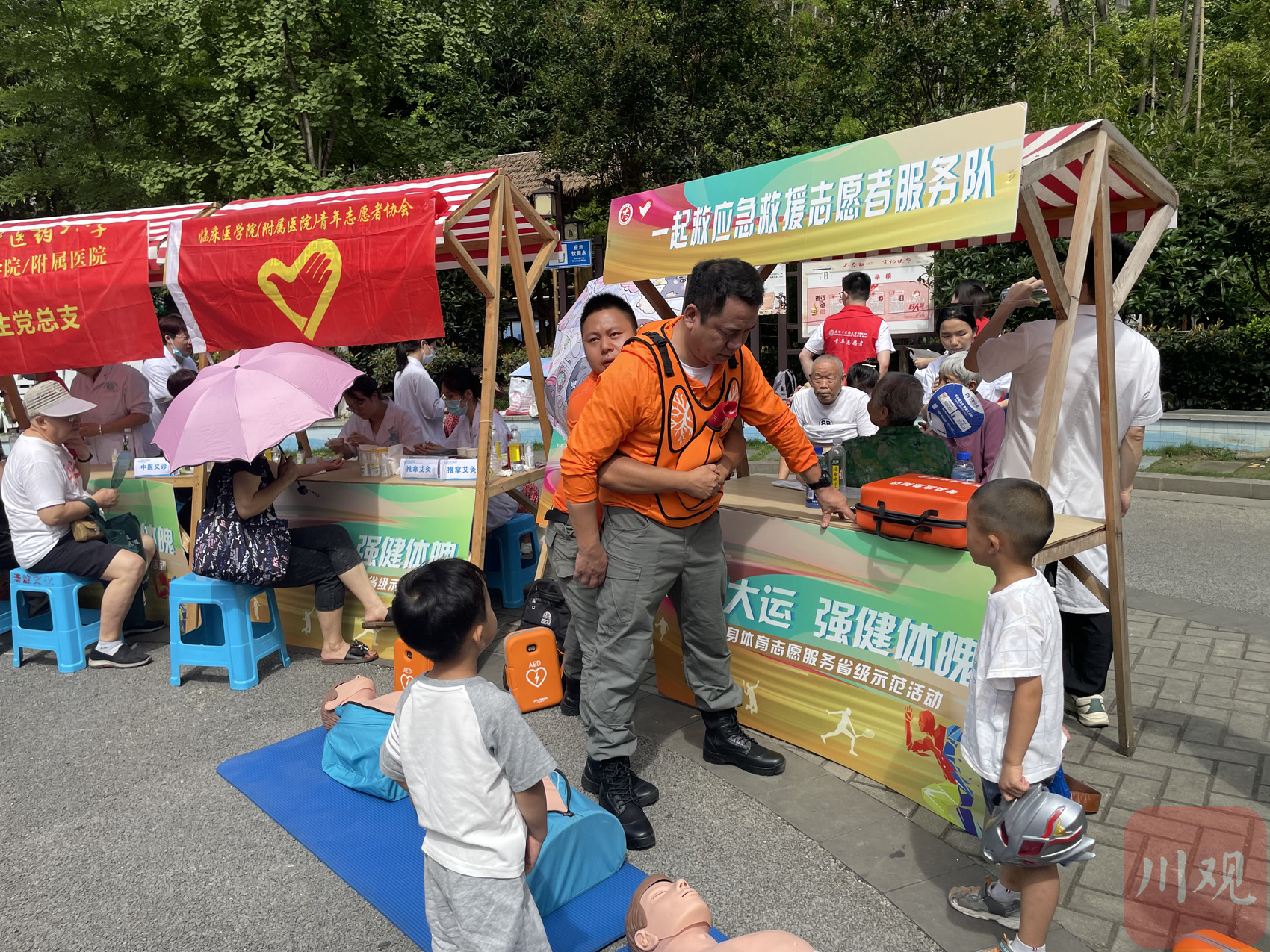 在活动现场,小学三年级学生黄译认真听壹柒玖应急救援志愿者服务队代表讲解海姆立克急救法,用人体道具模仿急救动作;市民徐彩霞带孩子体验了6项中国传统体育互动项目(投壶、射箭、套圈、毽子、蹴鞠、乒乓球),感受亲子运动的乐趣;56岁的汪莉在成都中医药大学志愿服务摊位体验艾灸理疗,她说自己年轻时也曾爱好打篮球、打羽毛球……不少市民表示,希望这些志愿服务能经常走进社区,来到群众身边。