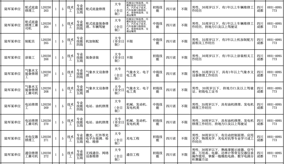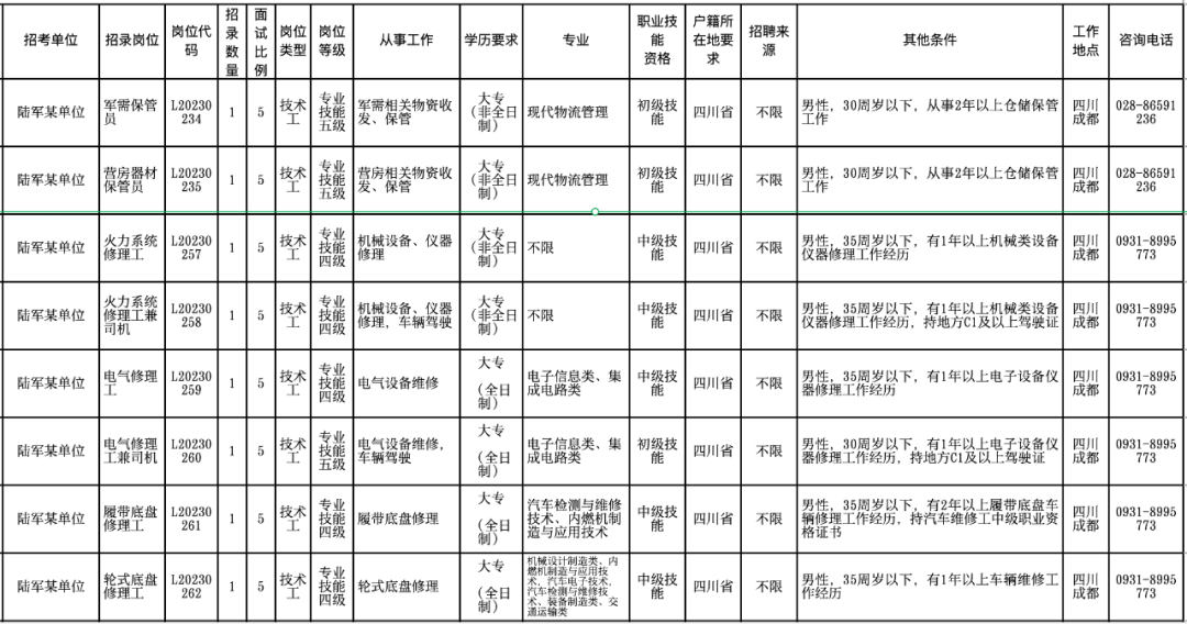 陆军所属用人单位的教练员、保管员、修理工、出纳、卫生员、司机等专业技能三级以下岗位,共招考1873人。