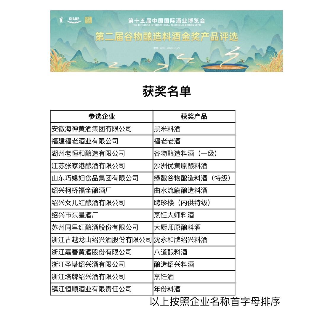 第二届谷物酿造料酒金奖共14家料酒入选——安徽海神黄酒集团有限公司的黑米料酒、浙江古越龙山绍兴酒股份有限公司的沈永和牌绍兴料酒、山东巧媳妇食品集团有限公司的绿酿谷物酿造料酒(特级)等。浙江古越龙山绍兴酒股份有限公司的负责人寿虹志介绍,谷物酿造料酒属于纯天然发酵,比之通过勾兑出来料酒口味更好,更健康,近年来受到消费者的喜爱,市场前景非常好。