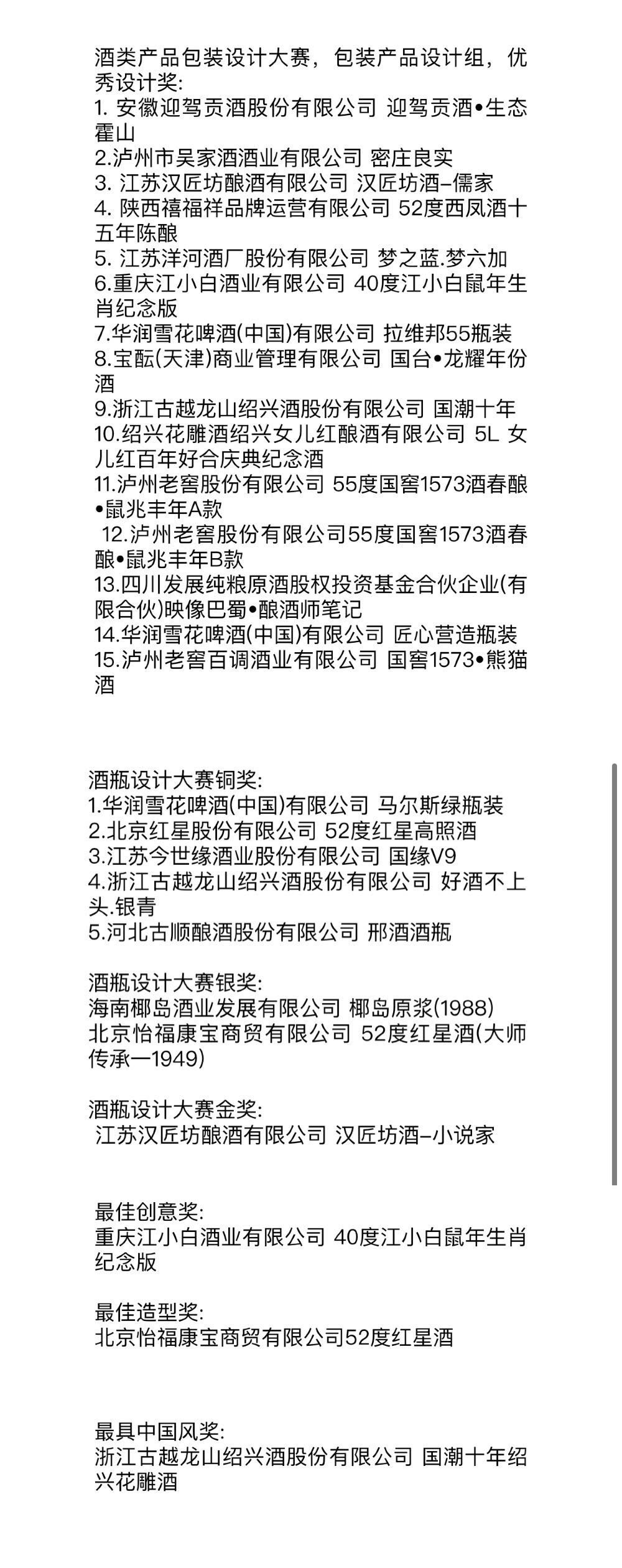 如果说前两个奖项是比拼口味、质量,接下来颁布的大赛结果则是专注于“颜值”。今年的2020中国酒类产品包装设计创意大赛暨最美酒瓶设计大赛中,备受泸州市民关注的泸州老窖摘得3个优秀设计奖。最佳创意奖则被重庆江小白酒业有限公司的40度江小白鼠年生肖纪念版斩获。最佳造型奖则是北京怡福康宝商贸有限公司52度红星酒。最具中国风奖由浙江古越龙山绍兴酒股份有限公司旗下国潮十年绍兴花雕酒获得。