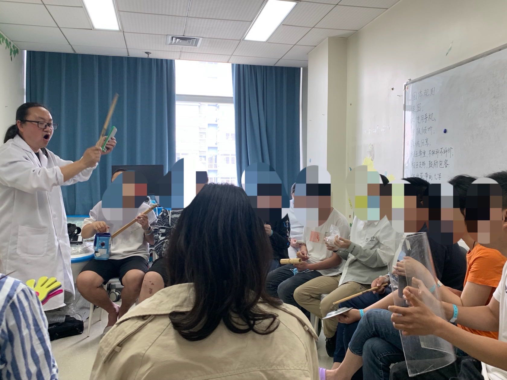 艺术家陈镪(左)在华西医院PICU策划的“南街28号乐队”声音工作坊(受访者供图)