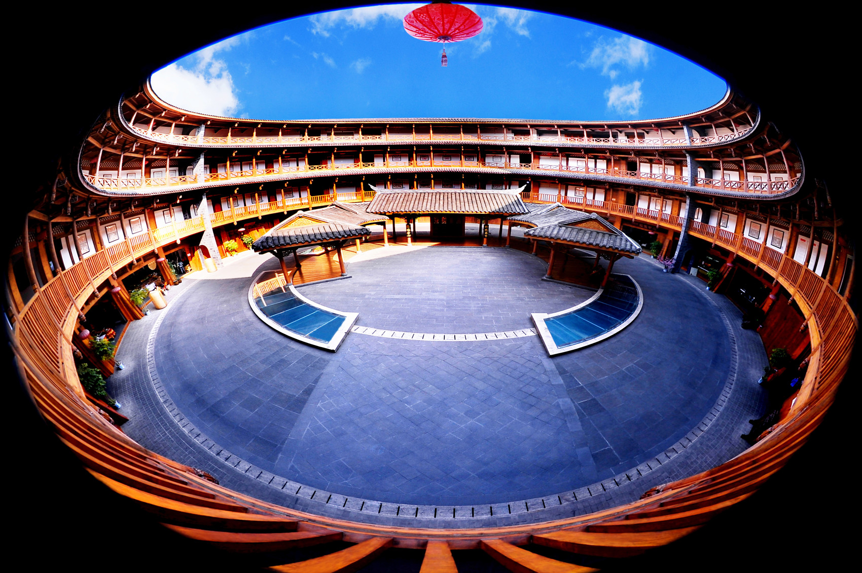 值得一提的是,如今,《大鱼海棠》同款土楼——博客楼,成为古镇内的网红打卡地。土楼是客家建筑的标志,洛带古镇博客楼于2012年落成,由全国著名土楼设计师、福建省建筑设计研究院首席总建筑师黄汉民教授设计。博客楼直径52米,总高18.8米,总建筑面积7800平方米,在保留客家土楼传统外观形式与古法施工的基础上,又加入了现代工艺与设计元素。走进博客楼,只见这里的客家文化展示体验中心,包含了文博文创、非遗传承、家风家教等。