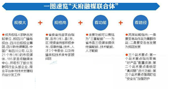 在省级媒体深度融合转型升级,县级媒体深度融合提质增效,市级媒体深度融合全面铺开、加快提速的关键阶段,7月17日,“天府融媒联合体”成立仪式在成都举行,四川传播“航母”——“天府融媒联合体”就此鸣笛启航。