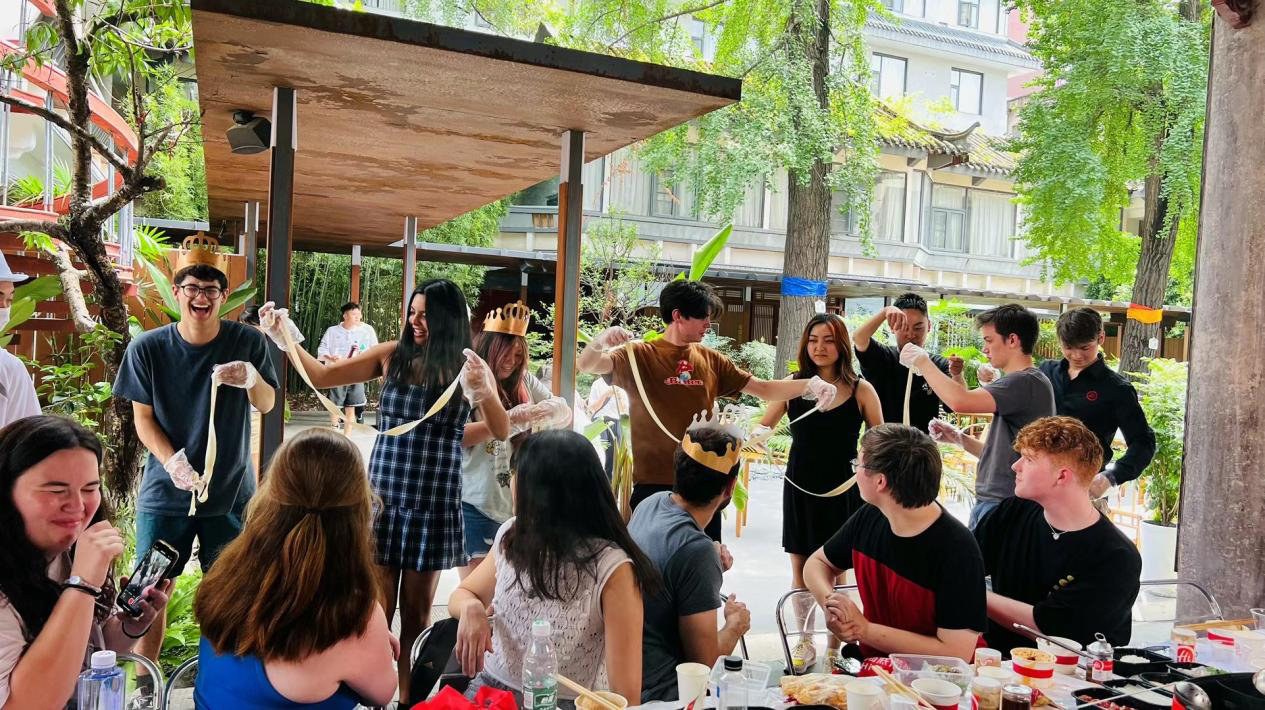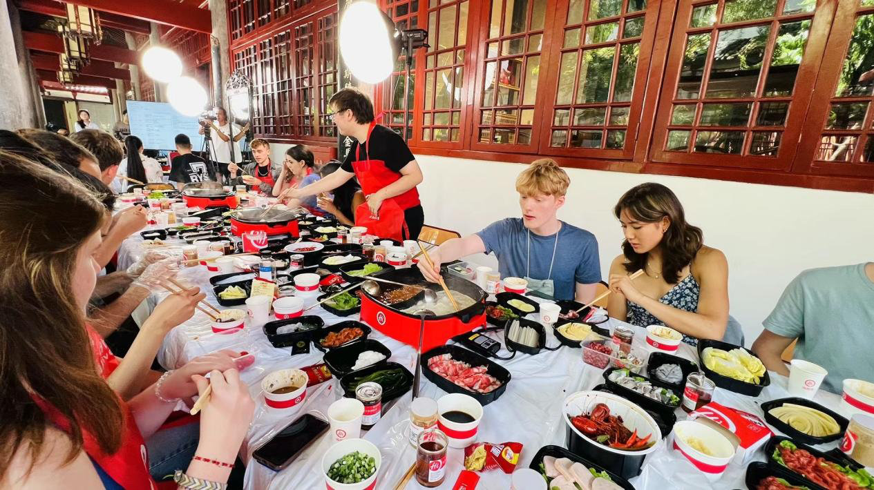 与此同时,来自耶鲁大学、宾夕法尼亚大学、布朗大学等高校的30名美国师生以及西南交大的师生们,在成都陕西会馆的庭院里也享用了海底捞外送的定制团餐。海底捞外送服务人员在现场介绍了每个菜品涮煮的时长、不同小料的调制方式。4名在7月过生日的美国大学生被“海底捞式生日祝福”感动到,另外海底捞外送工作人员还带来了川剧变脸、特色捞面等表演。