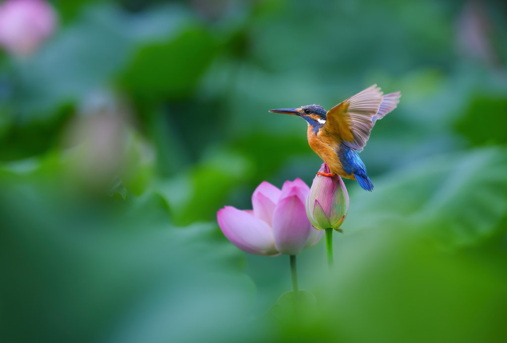 在绵阳市游仙区 ,一只翠鸟站在荷花上。新华社发 吴吉斌 摄