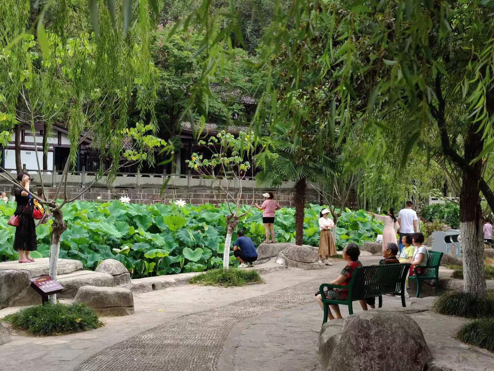 绵阳市涪城区西山公园,游客们在荷塘边赏景纳凉。吴克毅 摄