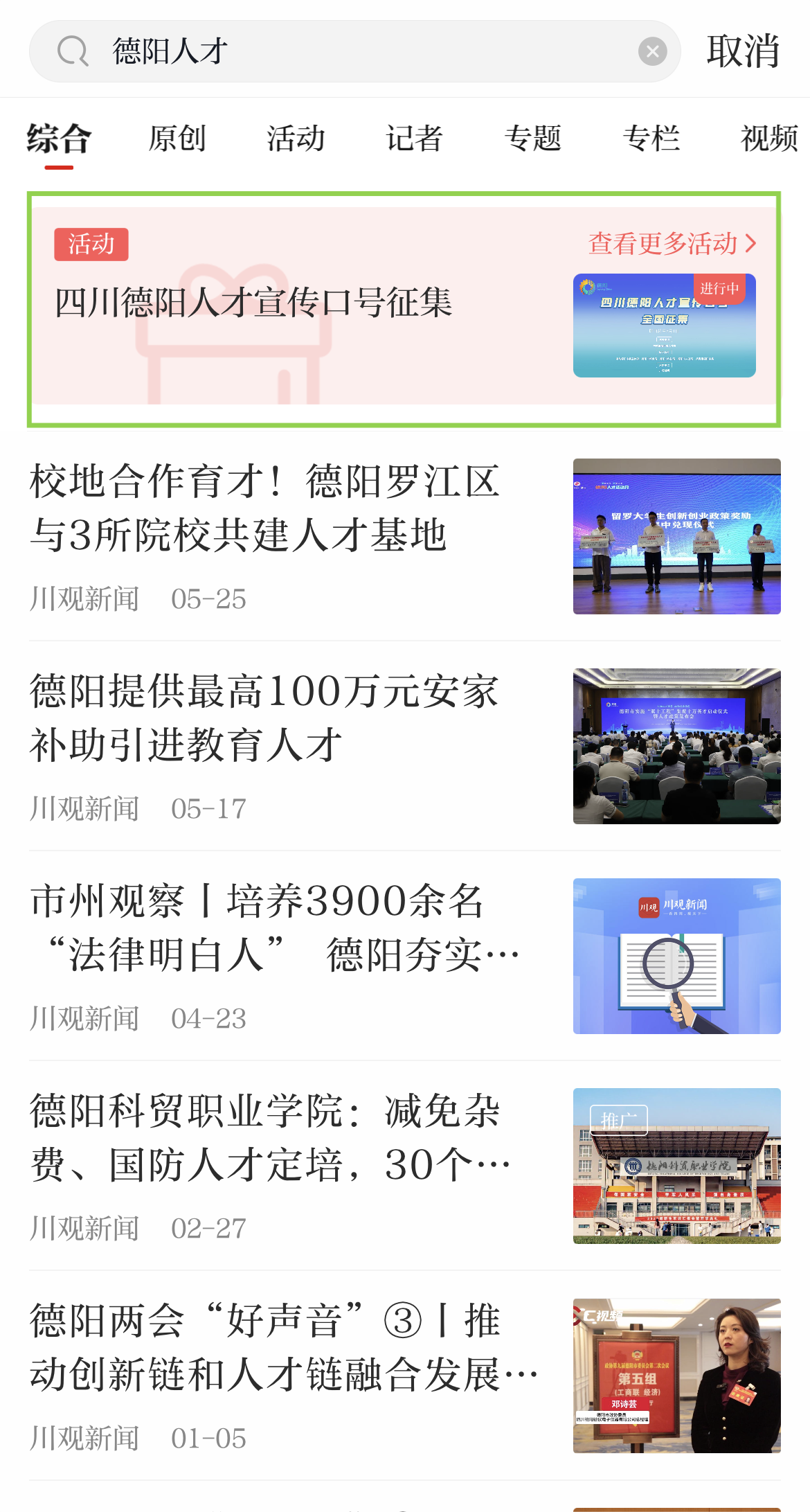 方式二:在川观新闻顶部搜索框输入“德阳人才宣传口号”进行搜索,在相应页面参与活动。