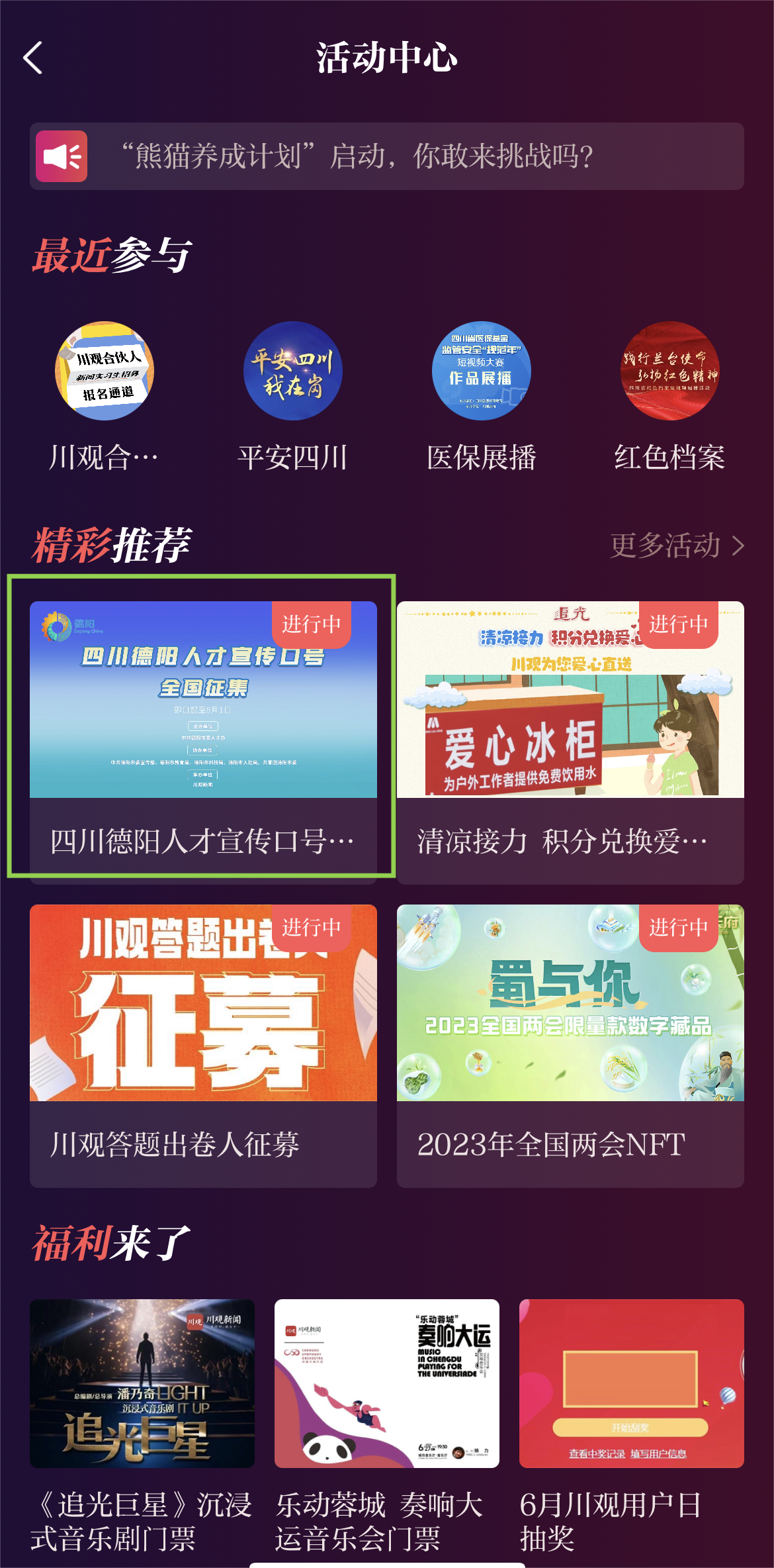 方式一:在川观新闻首页下方导航栏,点击“我的”,在“活动中心”找到相应活动专区,点击进入作品上传通道。