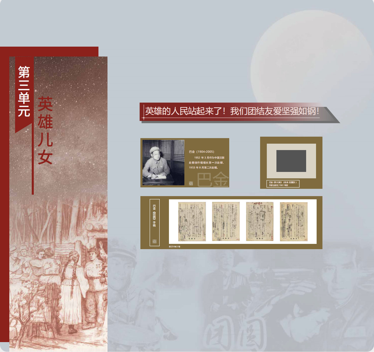 第三单元名为“英雄儿女”,“烽烟滚滚唱英雄,四面青山侧耳听,侧耳听……”一首荡气回肠的《英雄赞歌》至今仍在传唱,而这首歌曲的出处,电影《英雄儿女》更是一代人的回忆。但鲜为人知的是,这部电影是根据中国现代文学巨匠巴金的中篇小说《团圆》改编而成。本次展览,巴金的《团圆》手稿的复制件、《赴朝日记》的原件和《生活在英雄们的中间》的出版物校样等都将被展出。