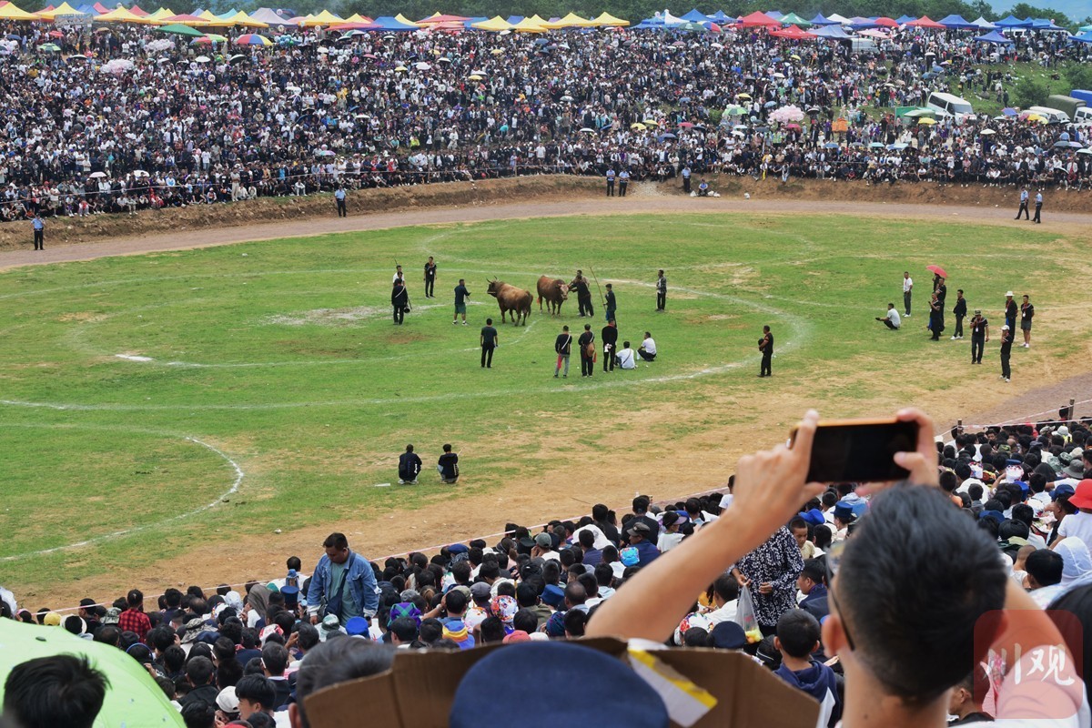 轮流上演的斗牛和斗羊,不断赢得火把场外观众们的欢呼声。斗牛、斗羊的碰撞声,与观众的加油欢呼声此起彼伏,响彻赛场。
