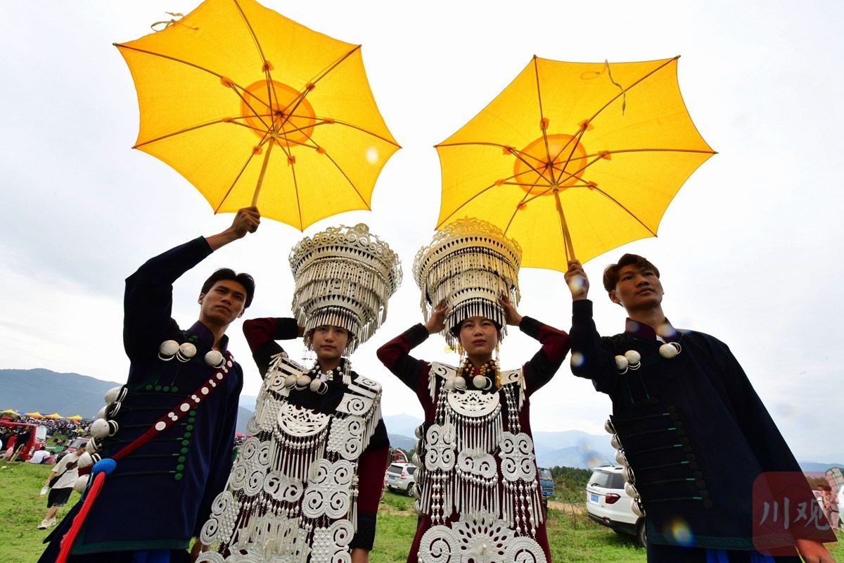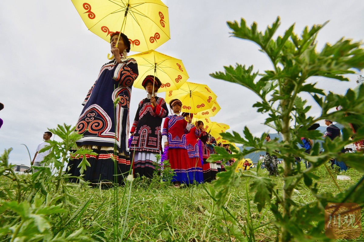 是谁撑开了那把金色的油纸伞,让丰收的喜悦铺满大地?朵洛荷演出中,一把把伞如同一朵朵索玛花争相开放,伞下的姑娘们迈着动人的步伐,围圈转动。