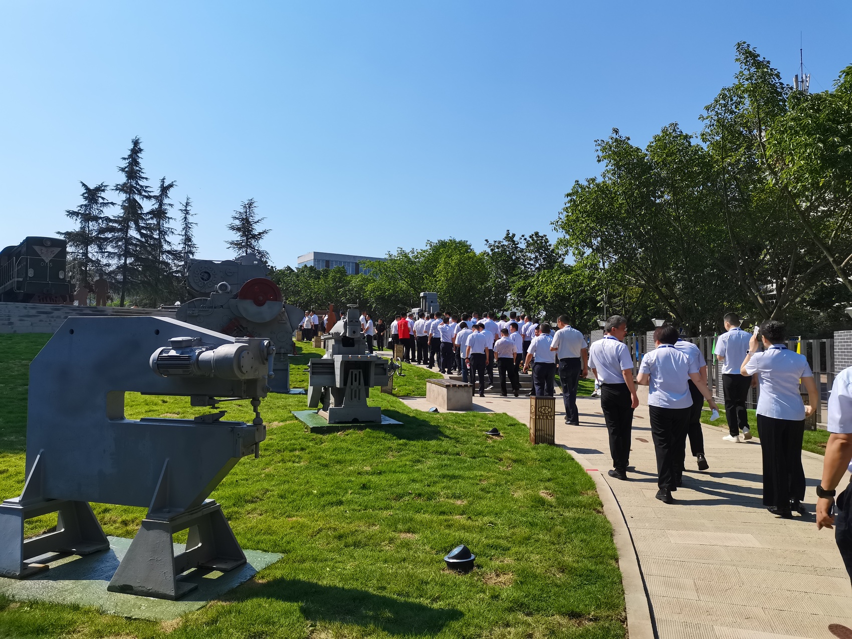 在园里,既有托举主题雕塑,以东方锅炉自主设计制造的第一台5万千瓦锅炉汽包为创作主体,下方通过对旧机器零部件的艺术塑形,形成坚实基座,寓意一代代东锅人艰苦奋斗托举起今天东方锅炉的不断发展,铸就迈向未来的力量;也有剪板机的传奇故事,它诞生于德国图灵根地区,经历了从欧洲再到哈尔滨的辗转,与东方锅炉的初创者们一起来到自贡,在这台机器上,诞生了包括朱祥富老师傅在内的多位劳模,它也和一代代东锅人一起书写着中国电力装备制造的传奇;还有密密麻麻镌刻着的2734名内迁职工的姓名,谱写出一首首激情澎湃的民族工业兴业史诗......