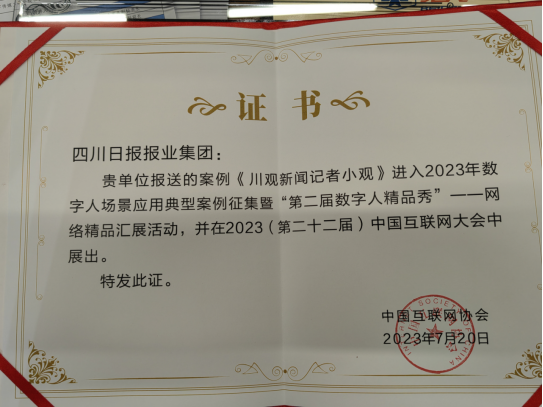 7月20日上午,2023(第二十二届)中国互联网大会数字人发展推进论坛在北京举行。“川观新闻记者小观”入选2023年数字人场景应用典型案例,受邀参加“第二届数字人精品秀”展示活动。同时,四川日报社也成为中国互联网协会发起的“中国数字人领航计划”合作伙伴单位。
